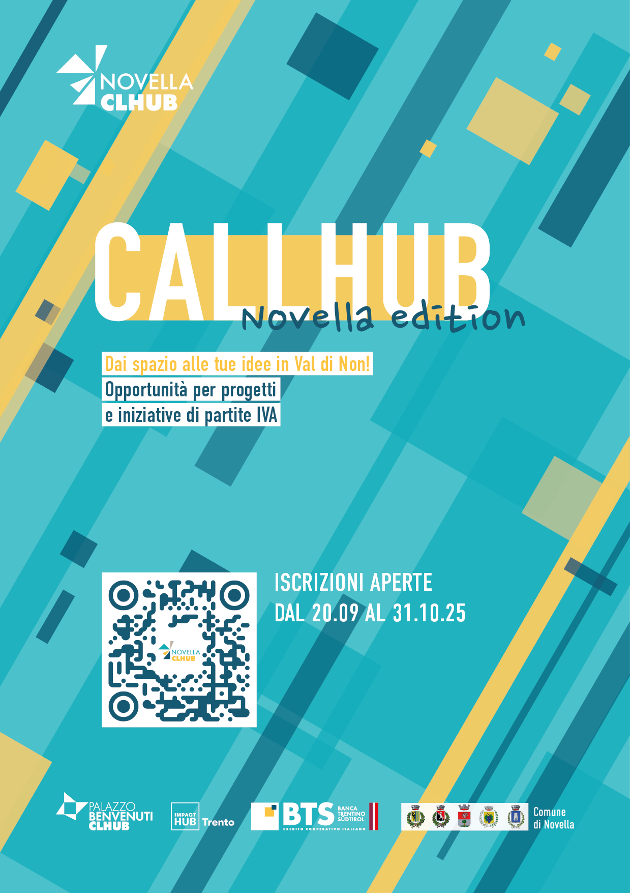 Dopo il successo delle passate edizioni torna, in veste rinnovata, il bando CALLHUB Novella Edition. Con il bando CALLHUB Novella Edition la Banca per il Trentino Alto Adige, in collaborazione con lo spazio di coworking Novella CLHUB e Impact Hub Trento, invita professionistə o aspiranti tali a candidarsi illustrando il proprio ambito di esercizio o presentando le loro iniziative professionali. In palio una postazione all’interno del nuovo spazio di coworking Novella CLHUB a Cagnò, accesso ad un network di professionisti e sei incontri di formazione gratuita su temi legati al fare impresa. Il progetto nasce con l’intento di: • stimolare la cooperazione tra professionisti presenti sul territorio; • promuovere e supportare la nascita di nuovi freelance / liberi professionisti; • favorire la creazione di relazioni che stimolino la creatività imprenditoriale del Trentino; • sostenere una community di persone interessate ai temi dell’imprenditoria