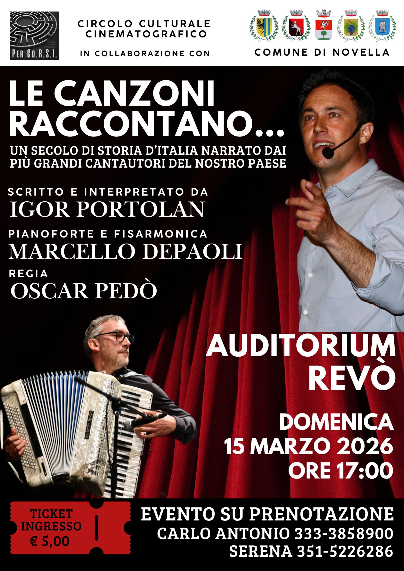 Le canzoni raccontano. Un secolo di storia d'Italia narrato dai più grandi cantautori del nostro paese. Igor Portolan e Marcello De Paoli Auditorium Revò Domenica 15 marzo 26 ore 17,00