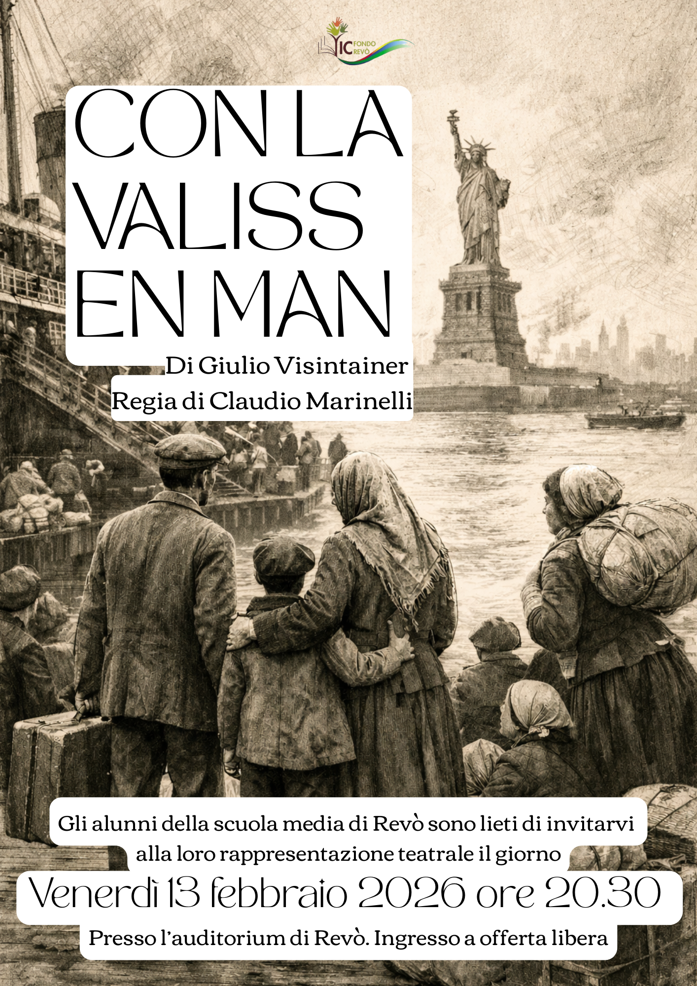 Descrizione Opera teatrale "Con la valiss en man"Opera teatrale dei ragazzi delle scuole medie Auditorium di RevòVenerdì 13 febbraio ore 20,30